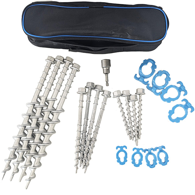 For a premium ground anchor check out our Promore Products' Aluminium Alloy Screw In Pegs Pack of 12. The pack of twelve screw-in pegs include 4 large pegs, 4 medium pegs and 4 smaller pegs. The pegs have a 17mm hex head that allows for a quick insertion and removal process with a cordless drill and a spiral structure to get that extra stability to any tough surface. In addition, the pack includes a 17mm drill socket, a carry bag and an assortment of guy rope clips. Check out our range of Promore Products for more.