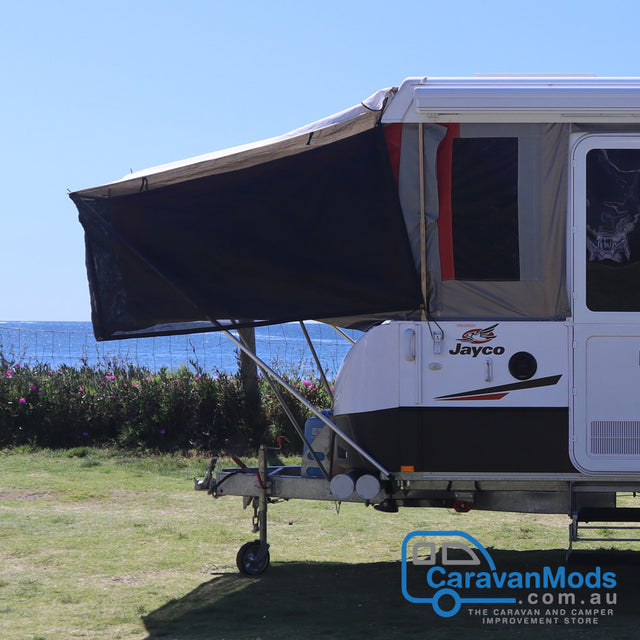 The bed fly conversion gives you the ability to convert your existing bed fly to a free standing structure. There are a number of options available when considering the bed fly conversion kit from CaravanMods.com.au. This is a pole conversion kit and it does not include the bed fly pictured.